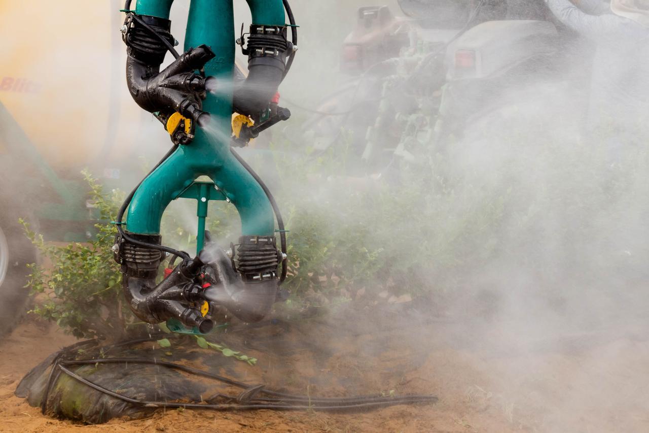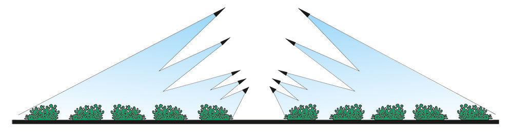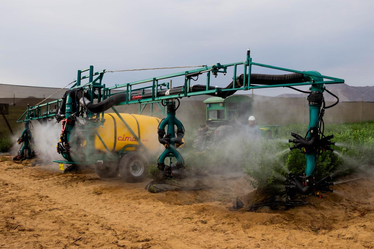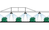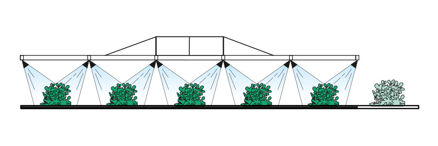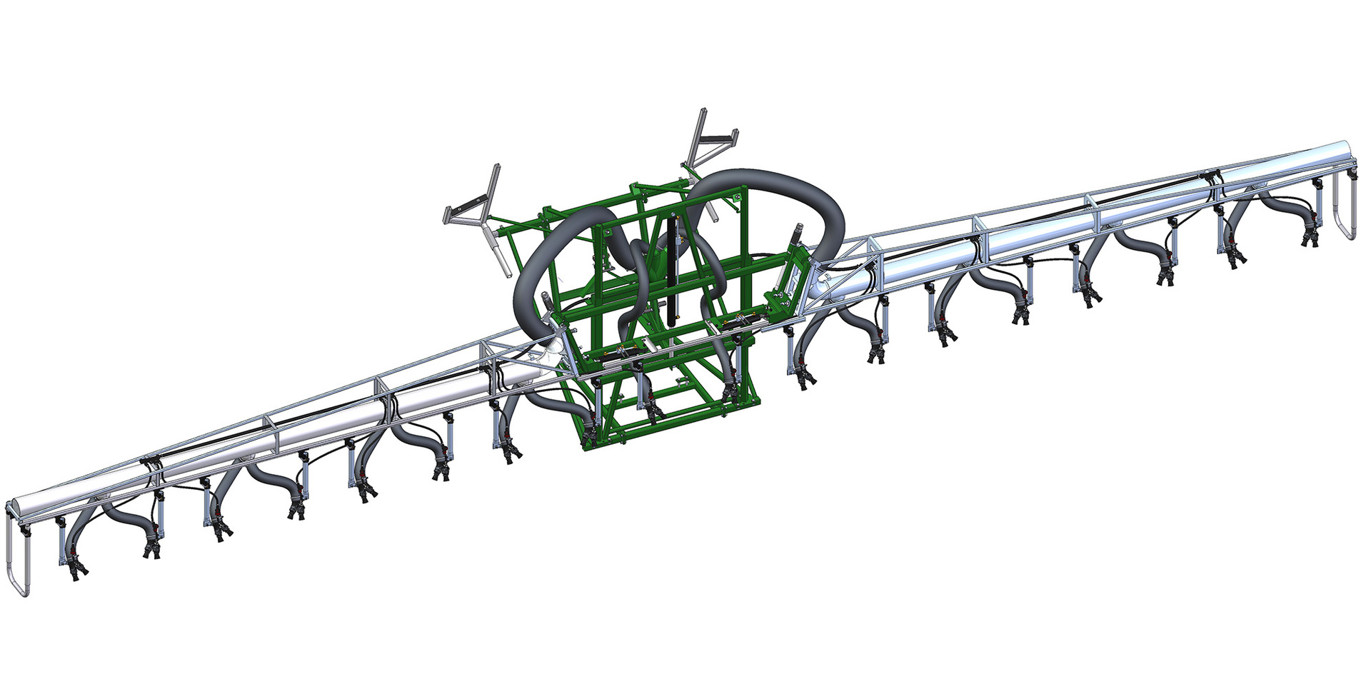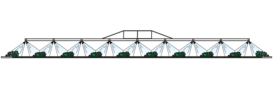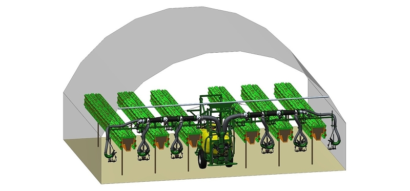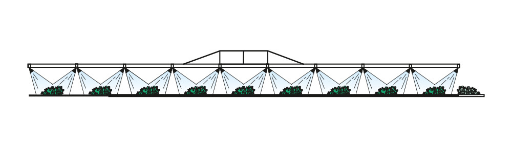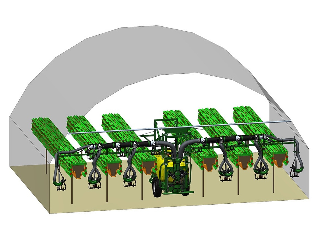 - Zabezpečuje najefektívnejšie pokrytie plodín pestovaných na stolových systémoch, kde je nevyhnutné ošetriť vegetáciu zo všetkých strán, vrátane spodnej strany listov.